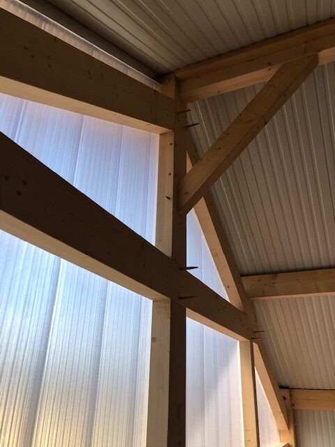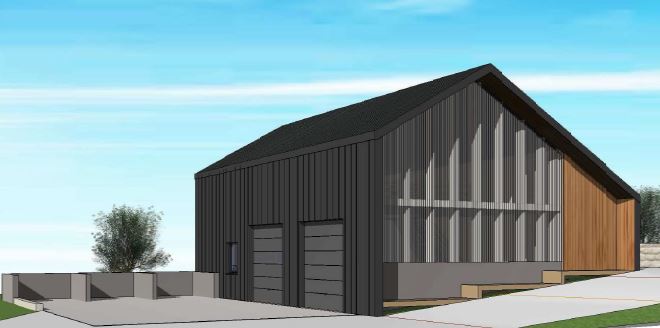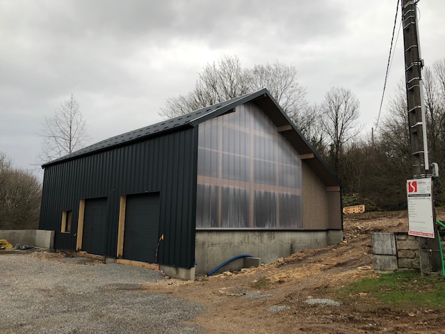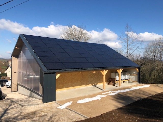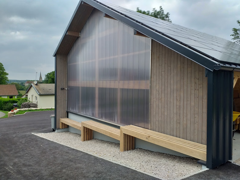 Au Sud, une grande ouverture (en polycarbonate) apporte lumière naturelle et transparence, tandis que le pan de toiture Sud/Est reçoit une surface de 88m² de panneaux photovoltaïques.