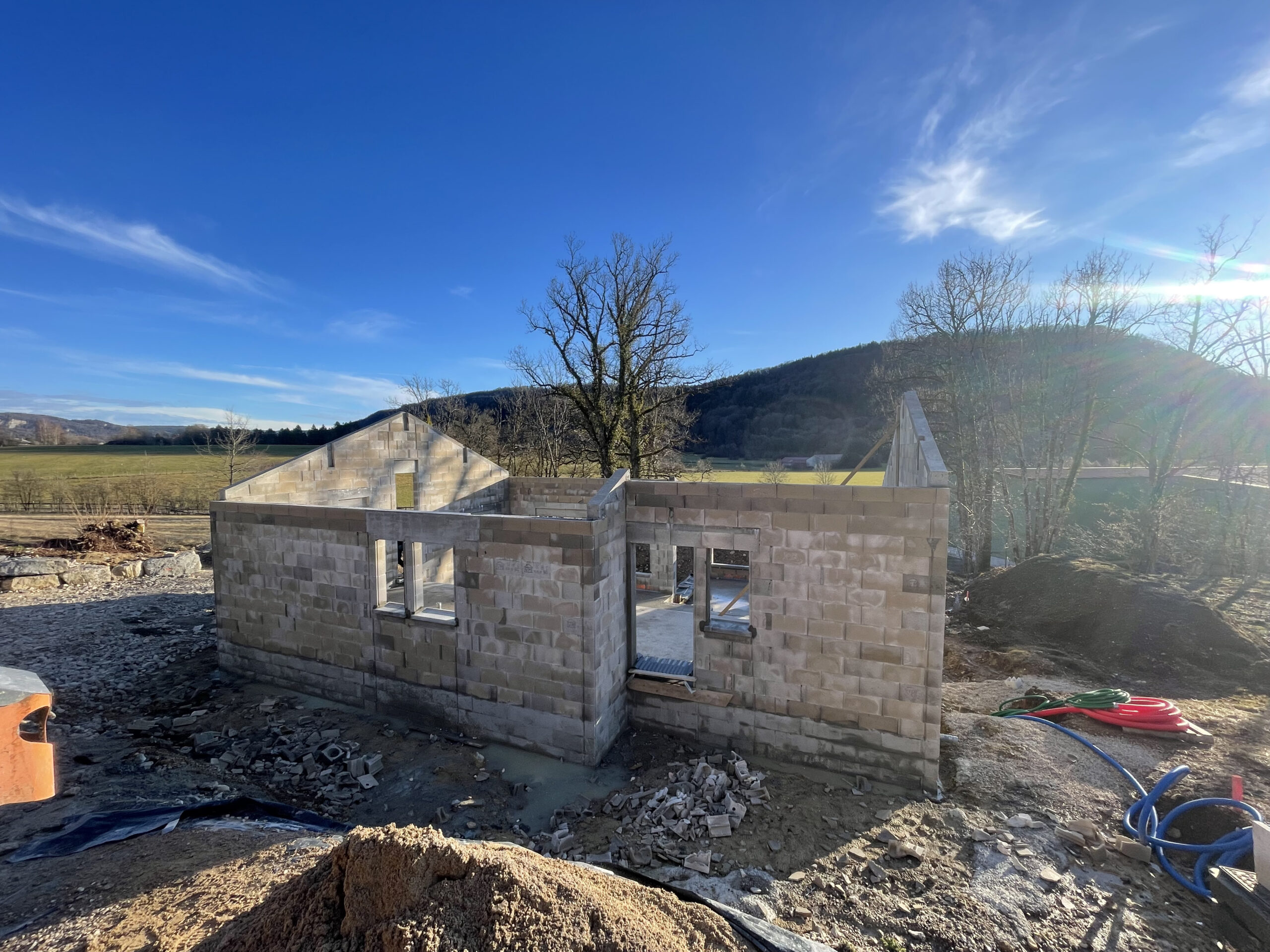Située à Ney, dans le Jura, cette maison individuelle à demi-niveaux s’implante avec sobriété sur un terrain en pente, en privilégiant une adaptation fine à la topographie existante. Le projet limite les terrassements et conserve une volumétrie maîtrisée afin de respecter le site et son environnement.