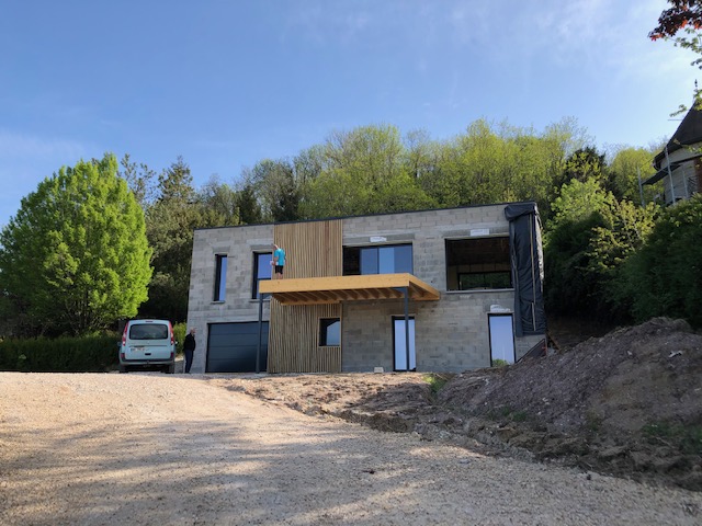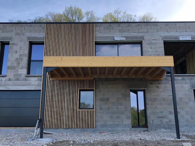 Les matériaux participent à l’intégration du projet : enduit à la chaux aux tons ocres clairs, bardage bois vertical, menuiseries aluminium RAL 7016 avec BSO intégrés, et bois apparents pour la terrasse et le carport.